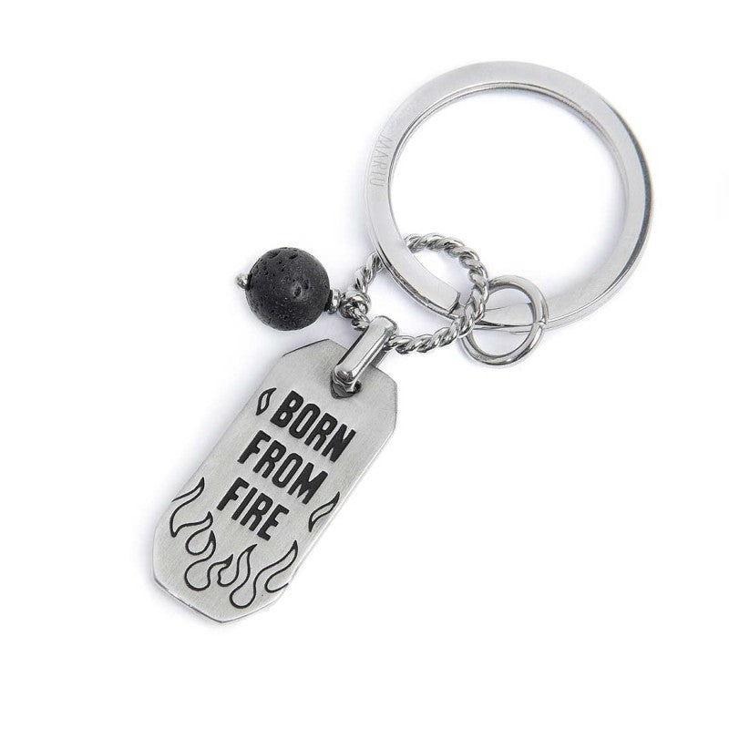 Portachiavi tondo in acciaio con diametro 30 mm con logo Marlù laserato sul fianco, contenente un anellino e un pendente con anellino con texture con pietra lavica e piastra in acciaio con sul fronte fiamme in rilievo e sul retro incisa scritta con black oil opaco "BORN FROM FIRE" e fiamme.