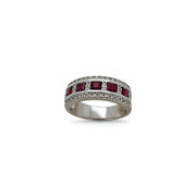 Questo anello fascia in oro bianco 18 kt è impreziosito da una raffinata sequenza di rubini taglio princess, incastonate al centro, che donano profondità e carattere. La cornice di diamanti luminosi valorizza ogni dettaglio, esaltando il contrasto cromatico tra la purezza dell’oro e l’intensità delle gemme.