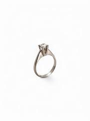 Un gioiello essenziale e luminoso: il solitario 4 griffes dritto in oro bianco 18 kt celebra la purezza delle linee e la bellezza assoluta del diamante. La montatura a quattro griffes, lineare e moderna, lascia la pietra protagonista, permettendo alla luce di esaltare al massimo la sua brillantezza naturale.