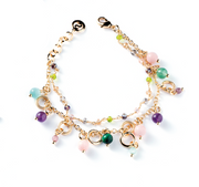 Collana in ottone finitura oro, con ametista, occhio di tigre smeraldo, giada cipria, occhio di gatto verde, avventurina e rosario multicolor.