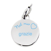 Charm in acciaio con incisione scritta "grazie" di colore azzurro, diametro 1.4 cm Materiali : acciaio, smalto