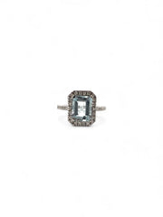 Anello in oro bianco 18 kt con acquamarina taglio smeraldo e diamanti.