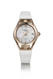 Movimento Solo Tempo al Quarzo Miyota, Cassa Acciaio e Titanio PVD Rose Gold da 36 mm, Quadrante con numeri arabi e indici applicati, Ansa da 18mm, Vetro minerale antigraffio trattamento zaffiro, Impermeabilità 10atm.