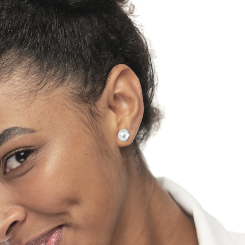 Mono orecchino a lobo in acciaio con diametro 1,1 cm a bottone con mezza perla.