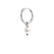 Mono orecchino in acciaio a cerchio con diametro 1,6 cm, con inserito un anellino da cui pende una perla. Lunghezza totale 2,5 cm. Materiali: acciaio, perla