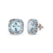 Orecchini in oro bianco con topazio taglio cuscino con contorno di diamanti, ioliti, london blue e topazi.