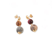 Orecchini in ottone, finitura oro 18kt con pietra di luna, occhio di tigre rosa e occhio di tigre rosso.