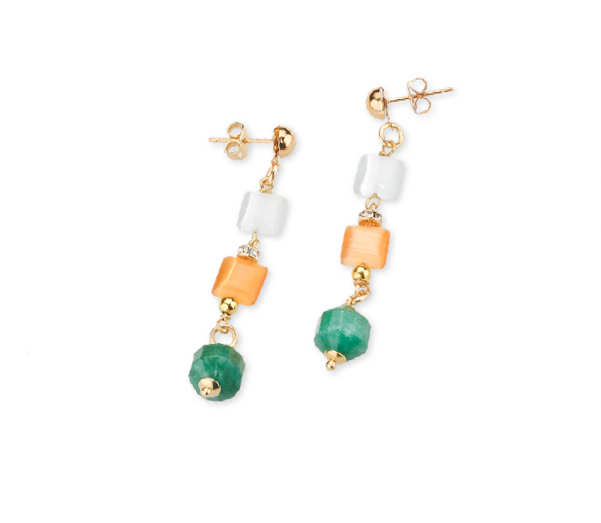 Orecchini in ottone con finitura oro 18kt con perla, occhio di tigre, occhio di gatto e giada verde.