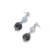 Orecchini in ottone finitura platino, con giada acquamarina e more blu.