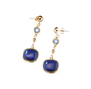 Orecchini in ottone, finitura oro con occhio di gatto blu notte e cristalli blu chiaro.