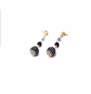 Orecchini in ottone finitura oro, con occhio di gatto celeste, giada acquamarina e more cristalli blu notte.
