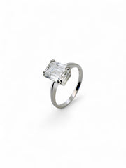 Linee decise, fascino intramontabile. L’oro bianco avvolge un diamante taglio smeraldo, celebre per le sfaccettature geometriche che creano un gioco di riflessi profondo e magnetico. Un anello che unisce minimalismo e potenza visiva, ideale per chi cerca un’eleganza contemporanea dal carattere distintivo.