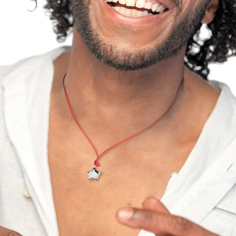 Collana con cordino in colore nero o in colore rosso con stella grande pendente in acciaio o acciaio pvd oro....