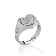 L’anello è caratterizzato da un doppio cuore impreziosito da un luminoso pavé di zirconi bianchi e da un piccolo angelo laterale in argento 925 placcatura oro rosa.