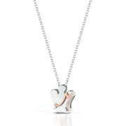 Collana in argento con angelo, lettera in argento rosato e zirconi bianchi.