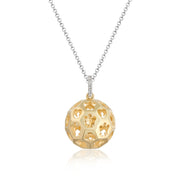 Collana chiama angeli con cuori, angeli traforati in argento giallo e contromaglia in argento bianco con zirconi.