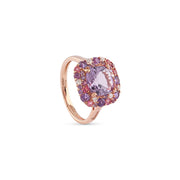 Anello in oro rosa 18kt con ametista viola taglio cabochon, pietre semipreziose e diamanti.