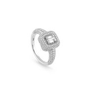 Anello in oro bianco e pavè di diamanti taglio brillante, con diamanti taglio baguette.