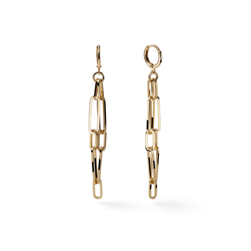 Orecchini lunghi donna in catena dorata. Maglia paperclip, placcatura in oro 24kt. Chiusura a monachella, lunghezza 8,00 cm. Il design elegante ed essenziale di questi orecchini lunghi è pensato per illuminare il viso e valorizzare ogni outfit con un tocco di luce e stile. Perfetti per un occasione speciale, per esaltare un abito da sera, ma anche per impreziosire un look casual, questi orecchini donna sono un gioiello placcato oro che unisce qualità e design contemporaneo.
