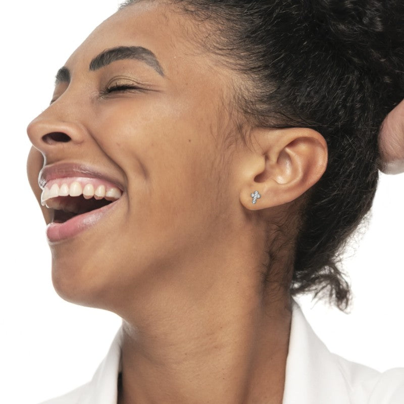 Mono orecchino a lobo in acciaio a forma di croce con cubic zirconia bianchi. Materiali: acciaio, cubic zirconia